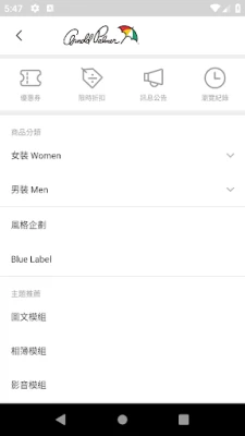 由美國家喻戶曉的高爾夫球名將Arnold Daniel Palmer所創立,他擁有高超的球技與出眾的衣著品味,在球場的穿著成為眾人追隨目標,因而開始發展個人同名品牌,並將高爾夫球場上常見的傘加入4個顏色經典紅、活力黃、純淨白、清新綠,將品牌精神完美注入於Logo中,從此這4色傘便成為Arnold Palmer的著名標誌。而4色傘設計靈感源自Arnold Palmer出賽時都吸引眾多忠實球迷持傘觀看,成千上萬的雨傘在球場蔚為壯觀,故4色傘也象徵他當年在球場叱吒風雲的光輝歷史,更使Arnold Palmer永恆經典的品牌形象在時腳步的推移下更深植人心。