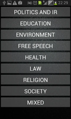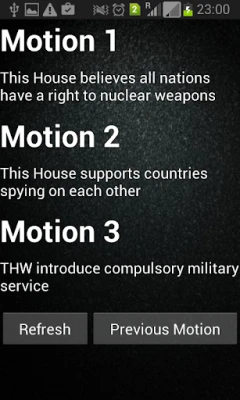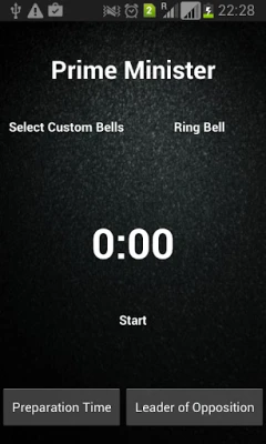 The timer starts with the preparation time and includes all speech times, and the application automatically switches to the respective speaker, whose position( eg. "Leader of Opposition") is displayed on the screen. The motions have been compiled from various sources and are spread over several themes, from which the speakers can choose.