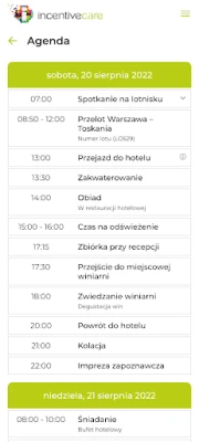 Aplikacja dla uczestników wydarzeń organizowanych przez Incentive Care. Znajdziesz tutaj wszystkie niezbędne informacje o wyjeździe, w którym bierzesz udział - dokładny program, informacje o hotelach, odwiedzanych miejscach i wiele innych praktycznych informacji.