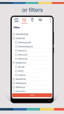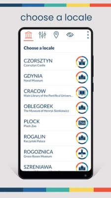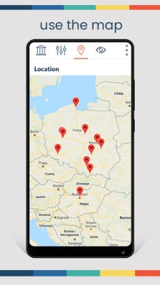 The application menu is available in Polish and English, whereas the audio guide content comes in multiple language versions (depending on the institution). A functional map will help you find the place you are looking for, and by filtering the results you can quickly pick the relevant path.