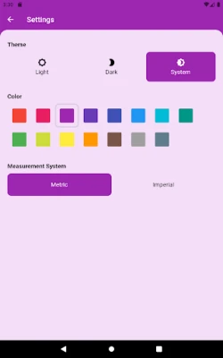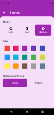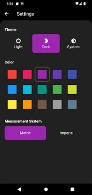 In the settings, you can change the theme (light, dark or use the system one), choose a preferred color and change the measurement system: metric (in km) or imperial (in miles).
