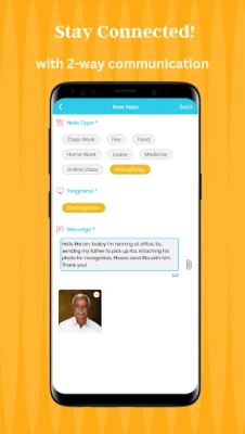 Need to inform the school about a different pickup person or ask a quick question? Send messages, voice notes, or documents securely through the app. Attach a photo for added safety—no need to worry about ID cards or last-minute calls.